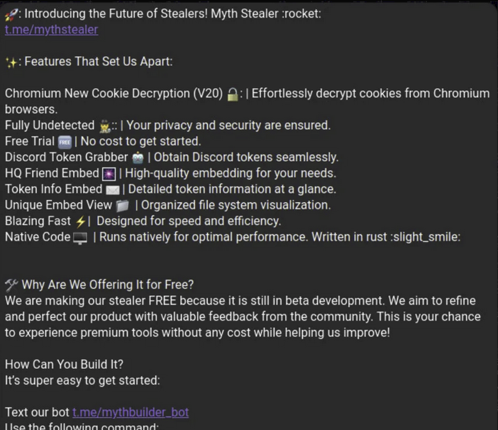 Security researchers at Trellix identified a fully undetected information stealer called Myth Stealer. Written in Rust, this malware has been marketed on Telegram since late December 2024. It was initially offered as a free trial for users to test its functionality and capabilities, before evolving into a subscription-based model.