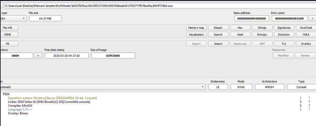 In my statistical analysis, I found that the file was classified as a console application, originating from a gaming website that distributes cracked software. Using DIE (Detect It Easy), while the program initially identified the code as C/C++, it was actually written in Rust using AMD64 architecture with a MinGW compiler.