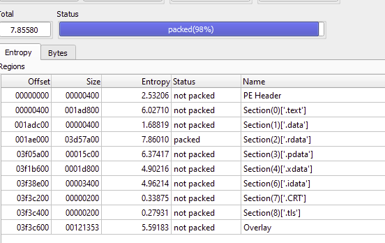 Analysis of the file's entropy shows it is heavily obfuscated, with 98 percent of the content being packed. This explains its large file size of 64 MB