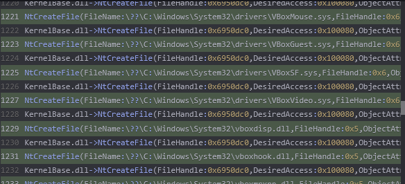 Upon execution, I received a game installation guide. However, the malware was simultaneously gathering information about its environment. It executed a query to check if it was running in a virtual environment. Below is a screenshot of the syscalls made. As shown, the malware uses NtCreateFile to check if specific files exist within the System32\drivers directory.