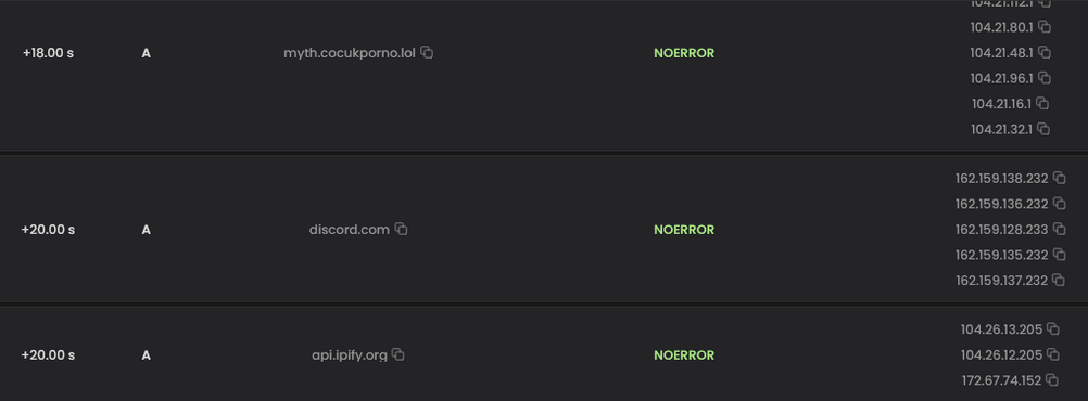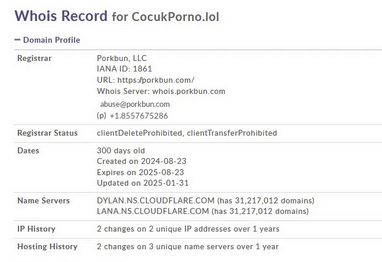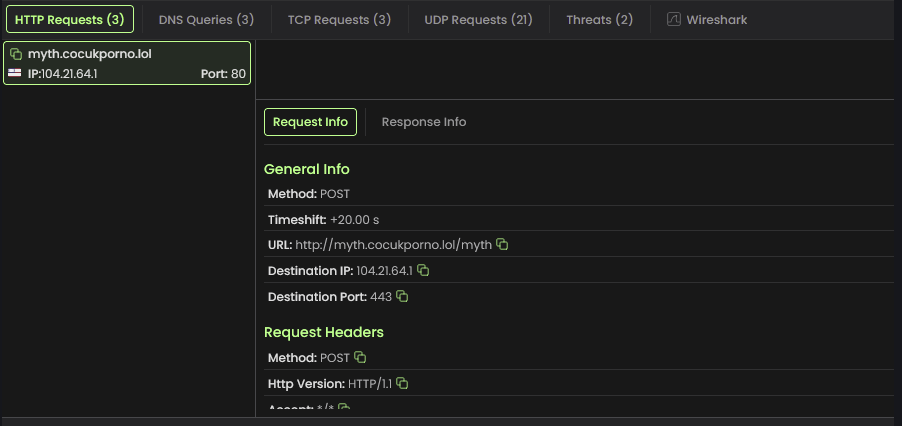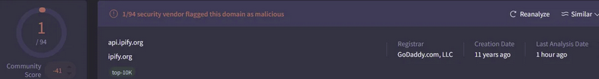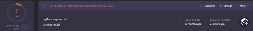 Analysis of the IP addresses reveals that all domains are hosted on Content Delivery Networks (CDNs), a technique threat actors use to mask their traffic. All domains have been flagged as malicious in VirusTotal. The domain api[.]ipify[.]org is commonly used by attackers to collect victims' IP addresses and system information. Network traffic analysis revealed a POST request to this domain, and examination of the captured PCAP showed a myth.zip file being transmitted. This suggests the domain serves as the Command and Control (C2) server. Further investigation of cocukporno[.]lol showed it was registered only 300 days ago, indicating it's a relatively new domain.