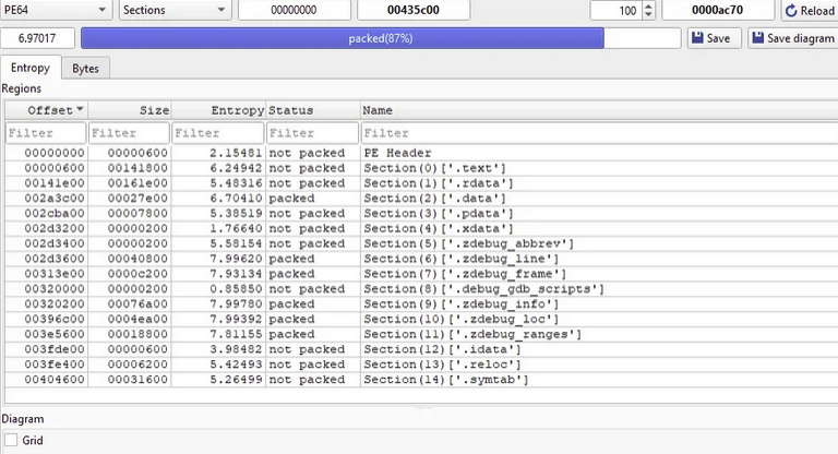 Analysis of the file's entropy shows that 87 percent is packed. Examining each section of the PE header reveals the following obfuscated sections: