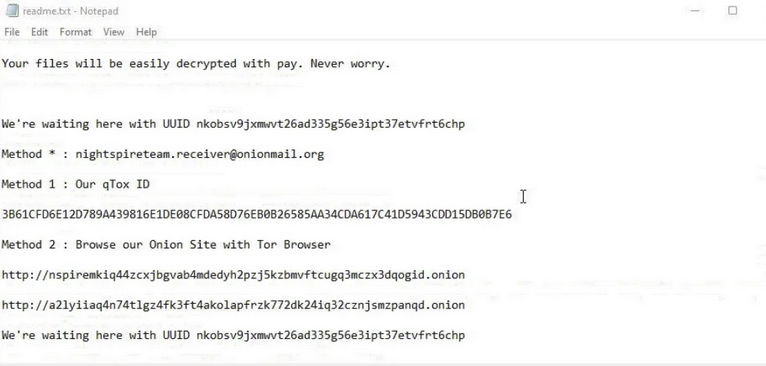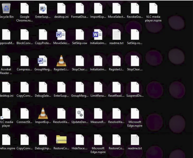 - Upon completion of encryption, victims find their files with the ".nspire" extension and a ransom note named "readme.txt" placed in each compromised directory.