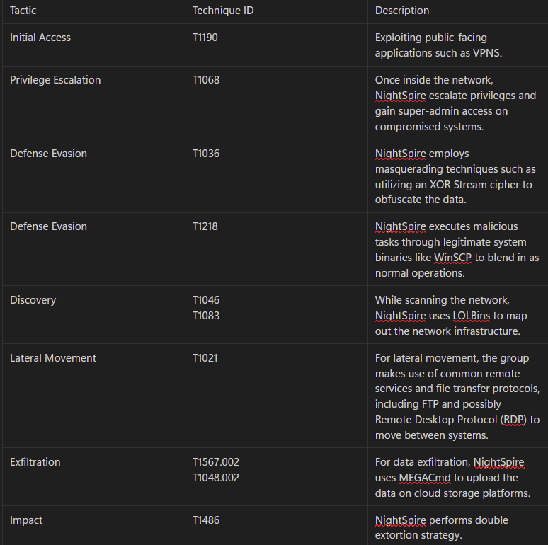 - After compromising the machine, the group relies on a combination of legitimate system tools and stealthy execution tactics to stay under the radar. Their toolkit includes WinSCP, MEGACmd, 7-Zip, and Everything.exe, all legitimate programs repurposed for malicious intent. NightSpire will then uses these tools to scan connected file shares and databases to identify high-value assets within the network.