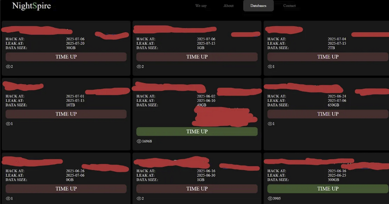 When visiting NightSpire's site, they have a "Databases" section that displays victim information. This section includes company names, breach dates, data sizes, and countdown timers indicating when public disclosure of stolen data will occur.