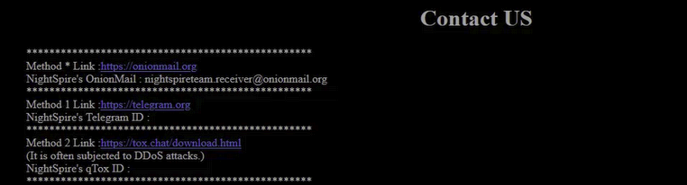 NightSpire uses multiple encrypted platforms for ransom negotiations, including ProtonMail, OnionMail, and Telegram. Their "Contact Us" page provides four communication channels: onion mail, Telegram, Tox chat, and Session. Each victim is assigned a unique ID in their ransom note, allowing NightSpire to track infections individually.
