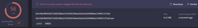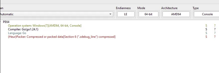 Analysis using Detect It Easy (DIE) showed that the malware is a Win32 executable written in Go programming language. The sample was compiled with Go compiler version 1.24.1. DIE also identified compressed data within section 6 of the PE header file.