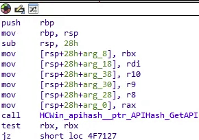 In this case, the malware has a function called HCWin_apihash_ptr_APIHash_GetCurrentProcess that loads kernel32.dll and advapi32.dll, then fetches a process where it calls GetCurrentProcess. The malware uses API hashing to invoke this function with a unique hash, bypassing security defenses from EDR, SIEM, and antivirus tools.