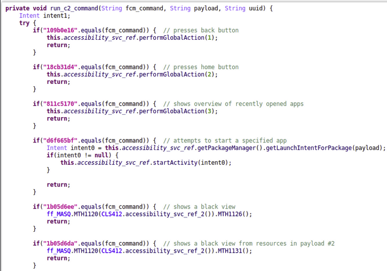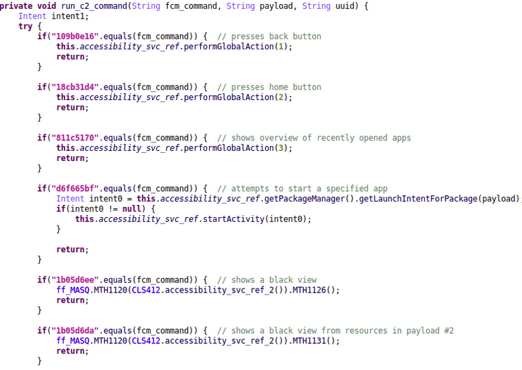 Android's Accessibility Services can be exploited to remotely control an infected device, allowing attackers to perform clicks, scrolls, and swipe gestures. Commands from the command and control (C2) server can be sent to the infected device using Firebase Cloud Messaging (FCM), a Google-provided messaging service. When the attacker sends a command-containing message to FCM, it triggers the malware to execute on the compromised device.