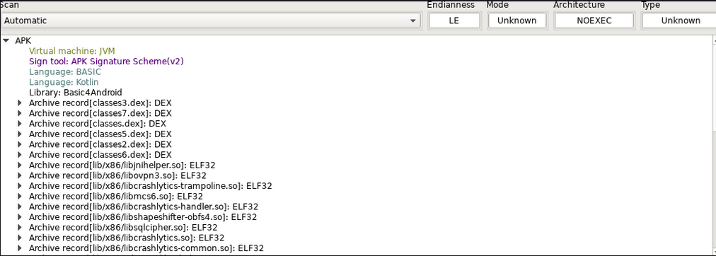 The APK package for Security MacaFee uses two programming languages: BASIC and Kotlin. The malware utilizes the Basic4Android library. Additionally, the APK file contains multiple DEX and ELF32 files.